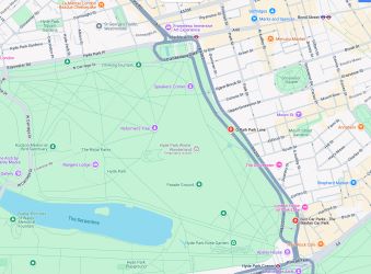 This car park is in a prominent location on the edge of Hyde Park between Hyde Park Corner and Marble Arch, surrounded by residential areas.