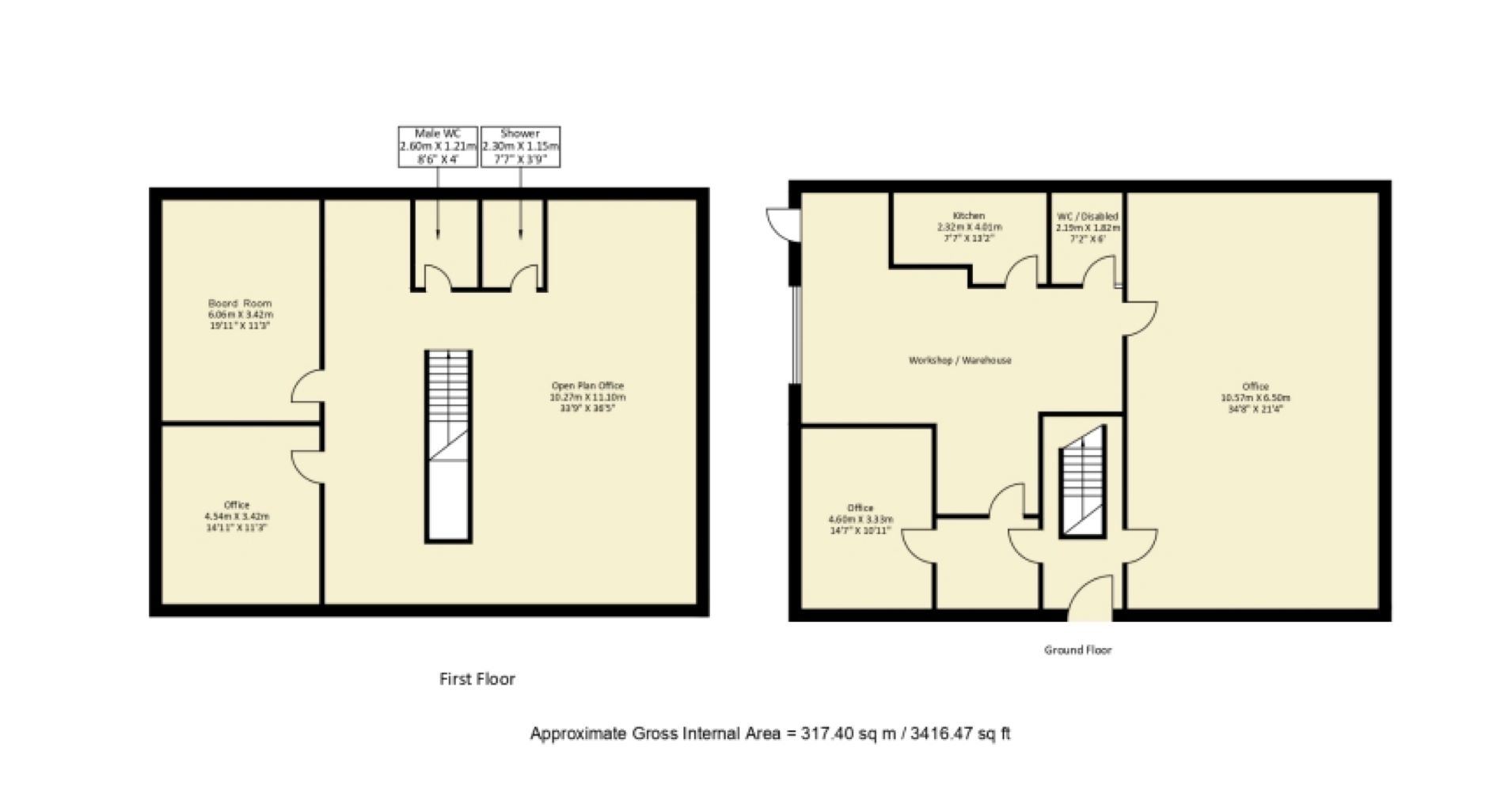 Vacant semi-detached two storey business unit arranged with ground floor offices and storage, and first floor offices. The unit is approximately 3400 sq ft.