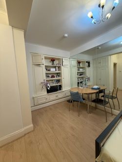 A raised ground floor studio flat in the well-maintained Sloane Avenue Mansions on Sloane Avenue, Chelsea. The property is in good condition, with a separate kitchen, bathroom, communal hot water and heating, and access to a communal garden.