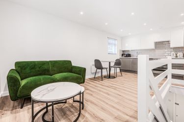 A three-bedroom split-level apartment with an open-plan living area and a balcony overlooking the Common.